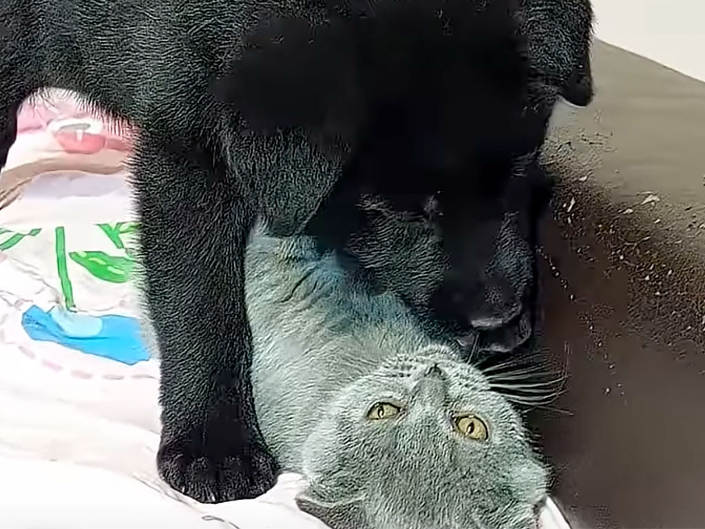 子猫は少し戸惑いながらも小さく「二ャーッ」と警戒。