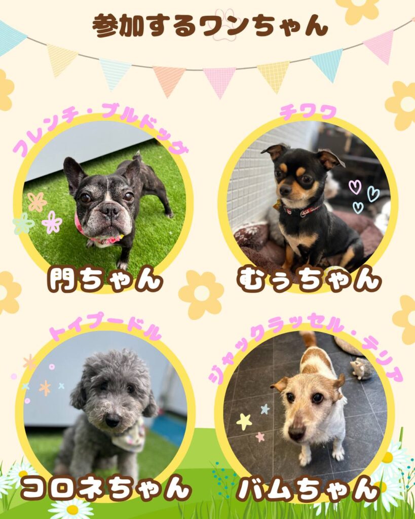 わんだん邸南千住店からは「門ちゃん」「むぅちゃん」「コロネちゃん」「バムちゃん」が参加予定です。