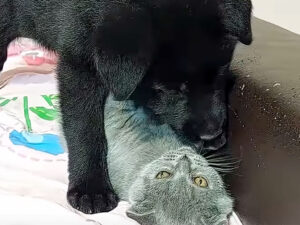 キッチンカウンターに登っている猫さん。 そして、その様子をちょっぴり羨ましそうに 下から見ている犬さん。 猫さんはどこにだって登れるけれど 犬さんはこういう高い場所には 登ることができないもんね。 でもこの黒猫さん、とっても優しい性格なので… -