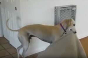 友達と外に出たいのに!ペットドアと格闘する犬。